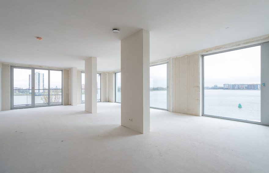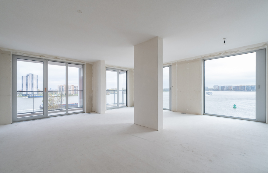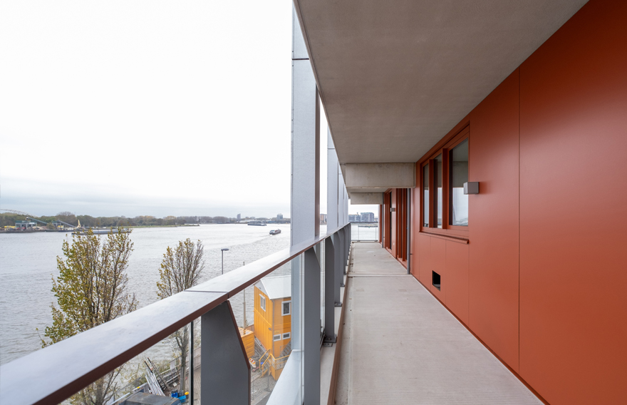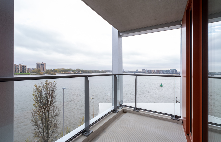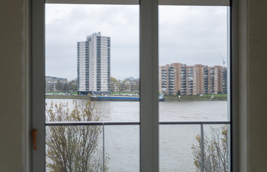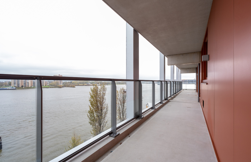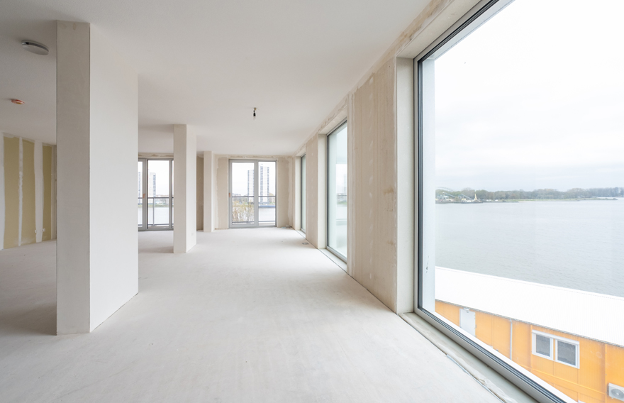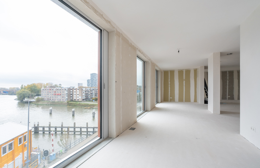 Ook de afmetingen, het stoere materiaalgebruik en het feit dat niks vastligt, maken de Drive-in Lofts de ultieme woning voor vrijbuiters. Een plek om je leven te leven zoals jij dat wilt. De buitenruimte is uniek; het balkon is zo breed is als de hele woning, maar liefst 18 meter breed en volledig parallel aan de Maas. Geniet van het adembenemende uitzicht, met de schitteringen in het water en de vrachtschepen en watertaxi’s sporen trekken in het water. En aan de overkant de koepel van de watertoren van De Esch, die ’s avonds prachtig verlicht wordt. Een ideale plek om het hoofd vrij te maken, in de verte te turen en de geest te laten waaien.