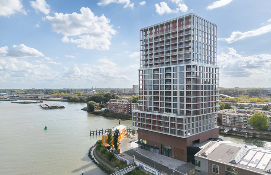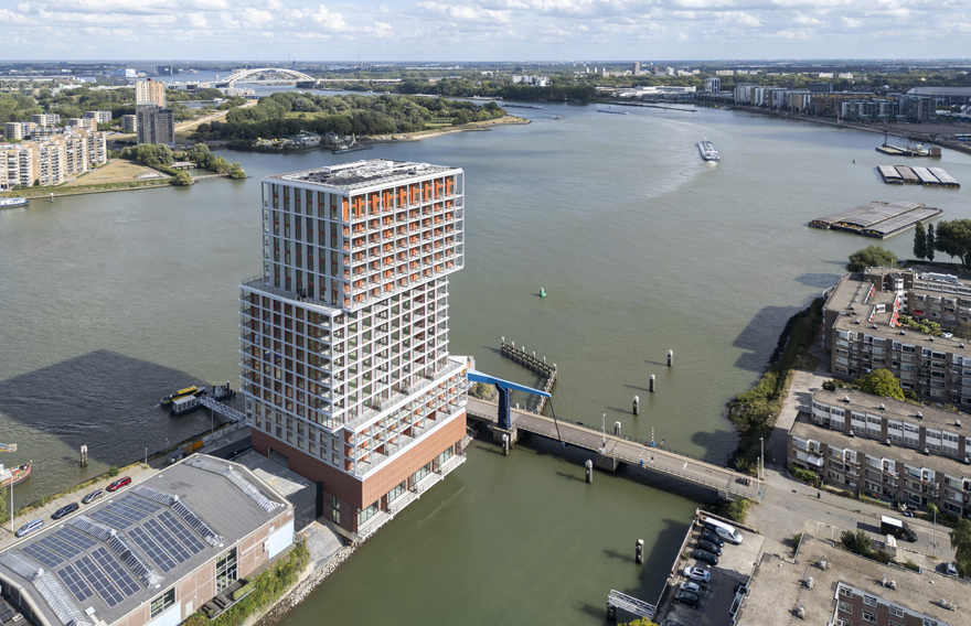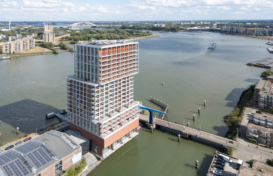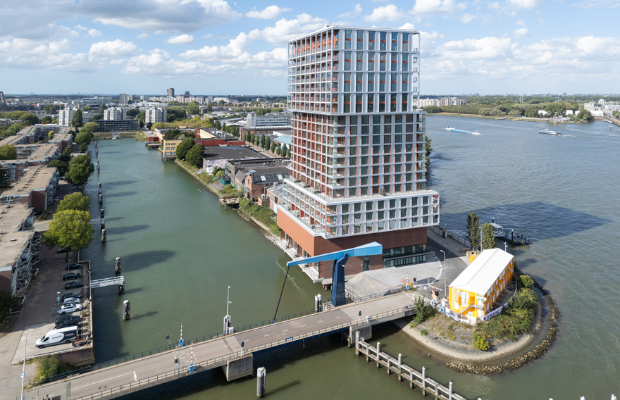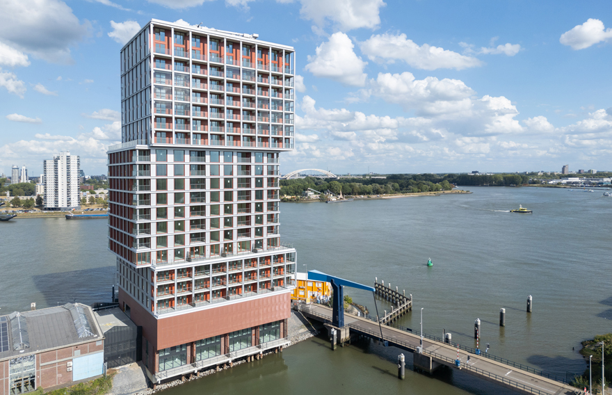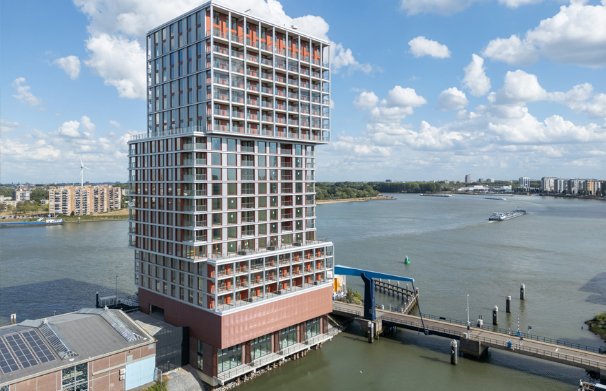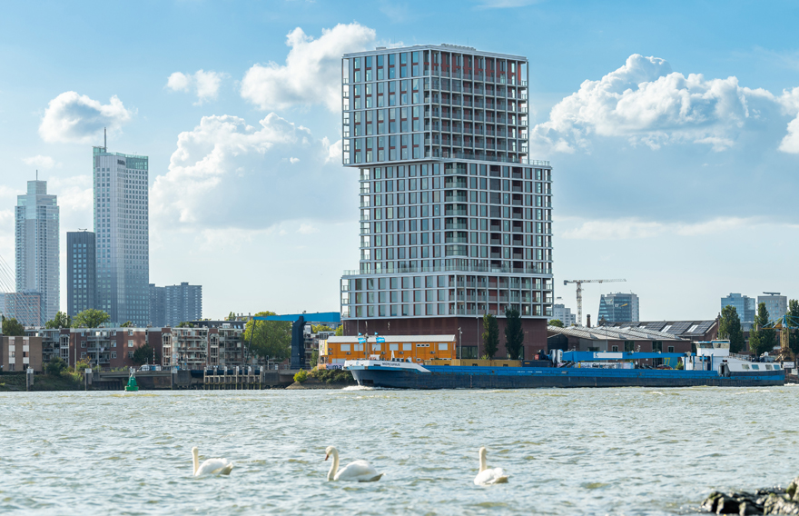 De twee verdiepingen worden verbonden door een glazen gevel, die een zee van licht naar binnen brengt. Of je nu boven of beneden bent, staat te koken, op de bank zit of ’s ochtends de gordijnen van je slaapkamer opent: elke keer dat je je hoofd richting raam draait is er dat wow-effect. En stap je via je glazen pui je balkon op, dan reikt je zicht nóg verder. Aan de zuidzijde zie je de Maas stad uit kronkelen. En aan de noordzijde is het alsof je de toppen van al die Rotterdamse iconen bijna kunt aanraken.