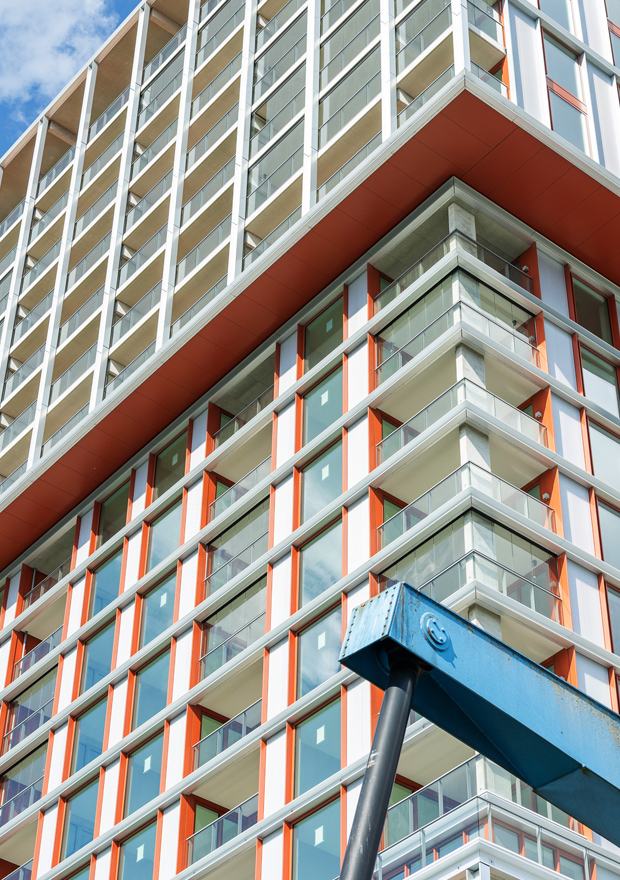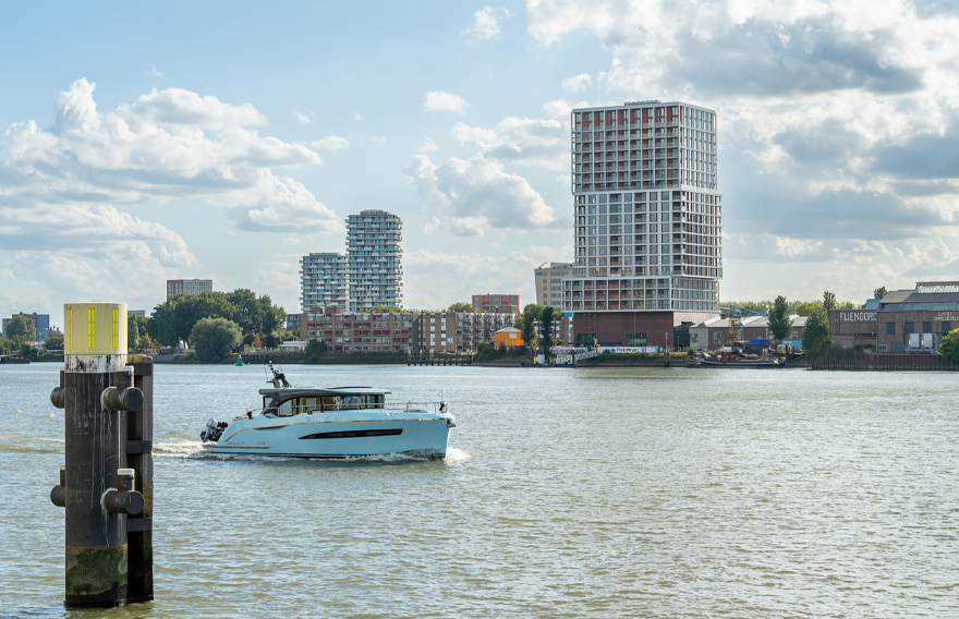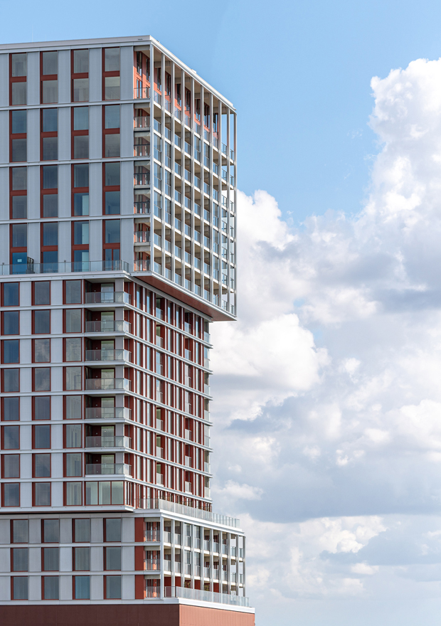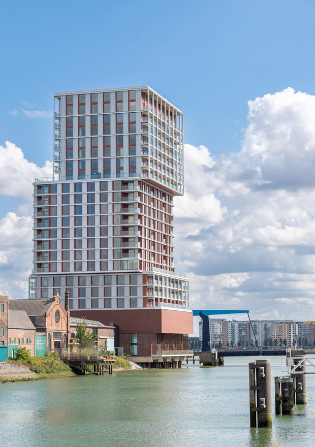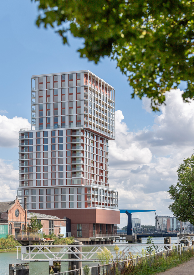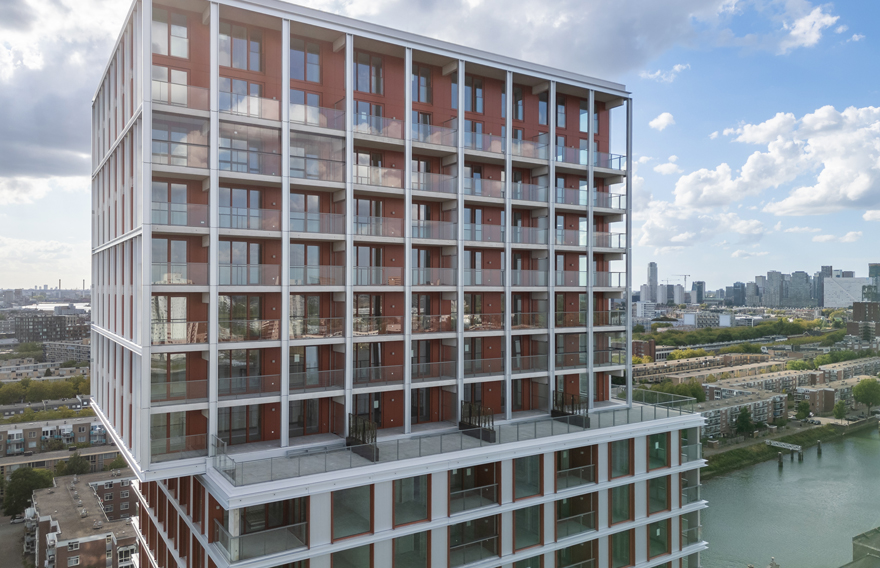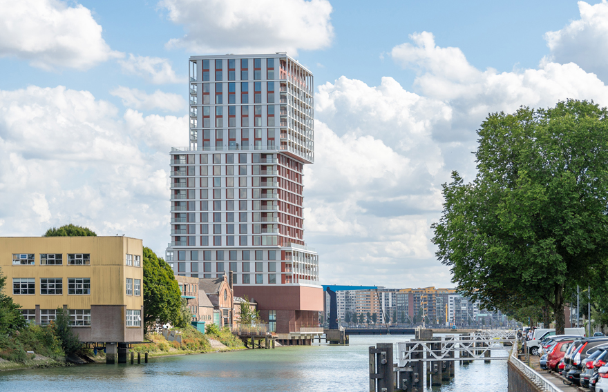 De twee verdiepingen worden verbonden door een glazen gevel, die een zee van licht naar binnen brengt. Of je nu boven of beneden bent, staat te koken, op de bank zit of ’s ochtends de gordijnen van je slaapkamer opent: elke keer dat je je hoofd richting raam draait is er dat wow-effect. En stap je via je glazen pui je balkon op, dan reikt je zicht nóg verder. Aan de zuidzijde zie je de Maas stad uit kronkelen. En aan de noordzijde is het alsof je de toppen van al die Rotterdamse iconen bijna kunt aanraken.